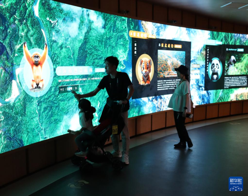 “花瓣”旁的弧形交互屏上介绍着三江源、武夷山、海南热带雨林等中国国家公园在野生动植物保护方面取得的积极成效。朱鹮、林麝等国家重点保护野生动物的体态特征、生存技能、分布情况等文字说明,公园面积、品种数量等直观数据吸引各国游客久久伫立。竹下说,中国的野生动植物种类繁多、超乎想象,中国馆的精彩展示让他大开眼界。
